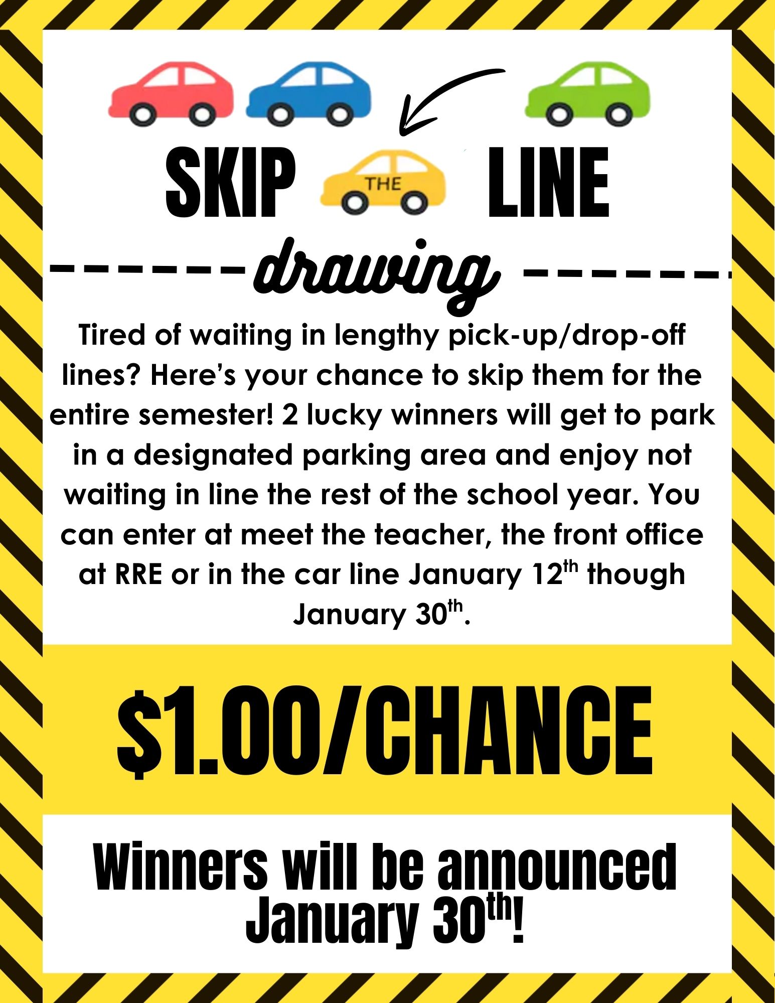 Feeling tired of waiting in the pick-up line at the elementary? Grab your chance today to win VIP parking for the rest of the spring semester and breeze past the long line! Just $1 per chance!